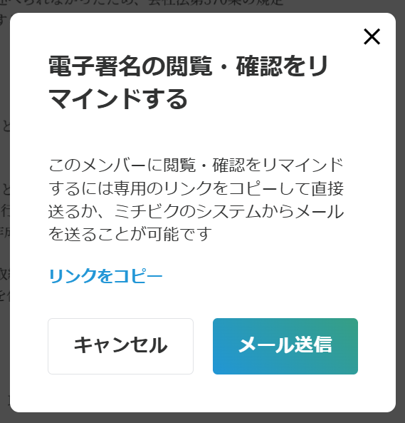 お手数ですが、こちらが可能性としてある場合は、「回覧中」という青文字部分をクリックいただき、「電子署名の閲覧・確認をリマインドする」というポップアップが表示されますので、署名依頼のメールを再送の上、該当のメールに記載のリンクより電子押印及び電子署名のご対応をご依頼ください。