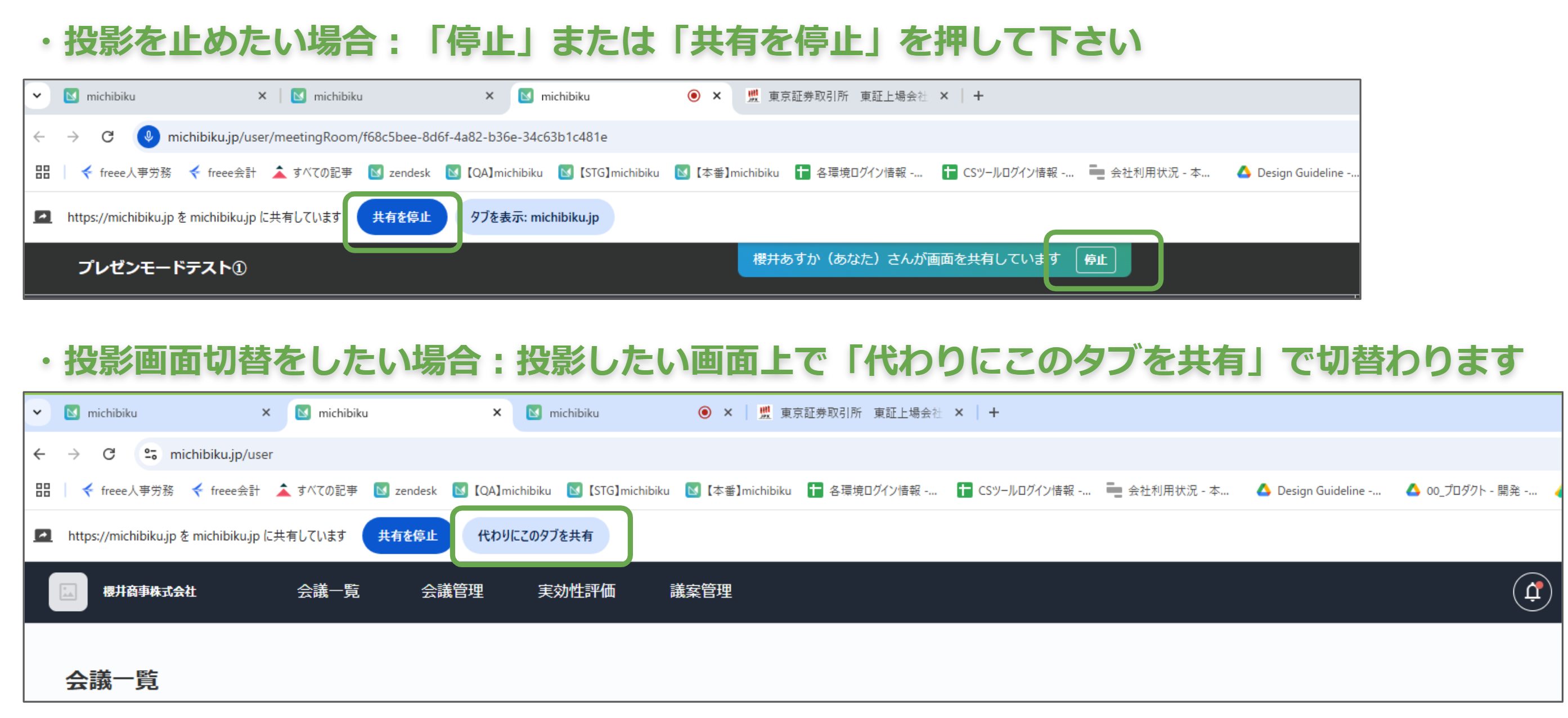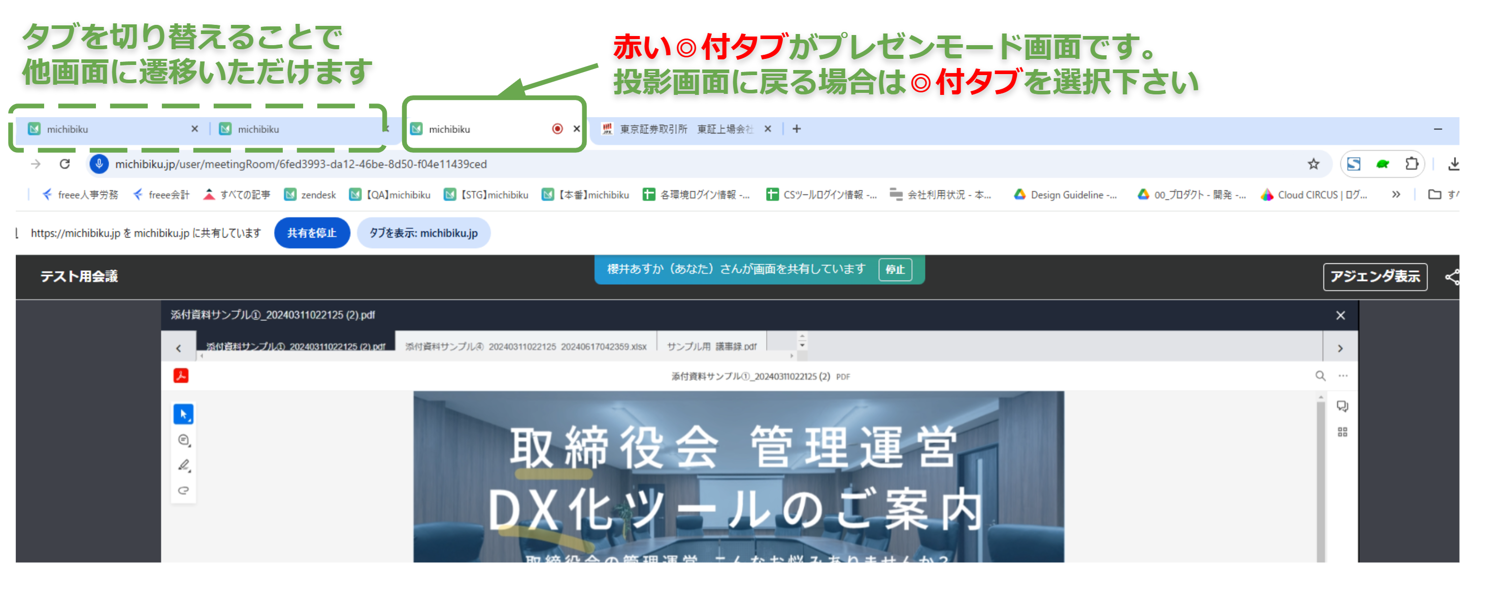 プレゼンモードはブラウザのタブ内で起動しているため、タブを切り替えいただければ任意の画面を閲覧することが可能です。