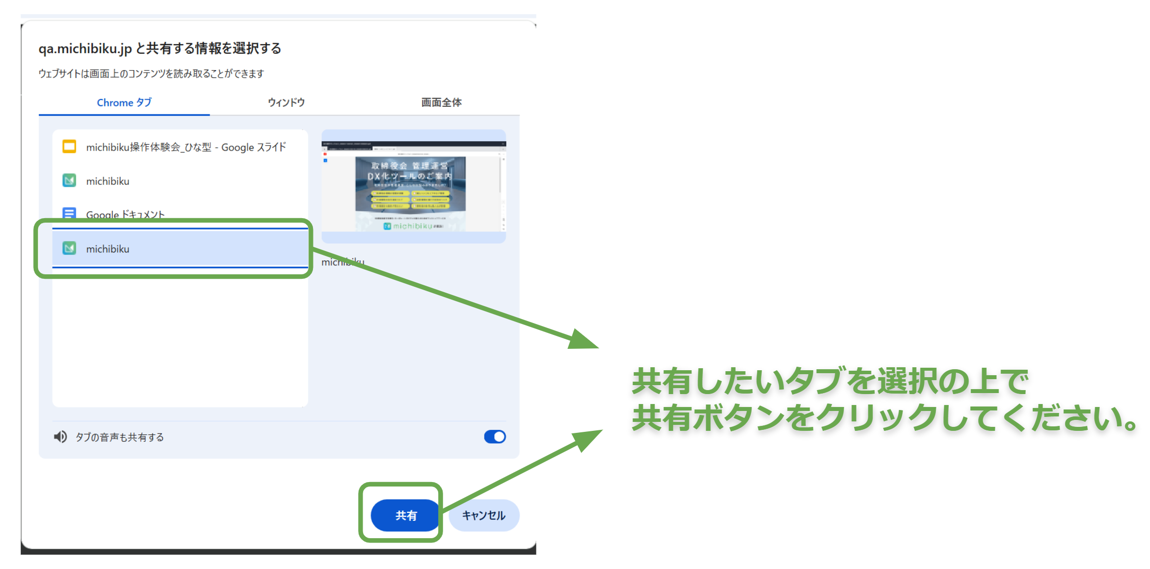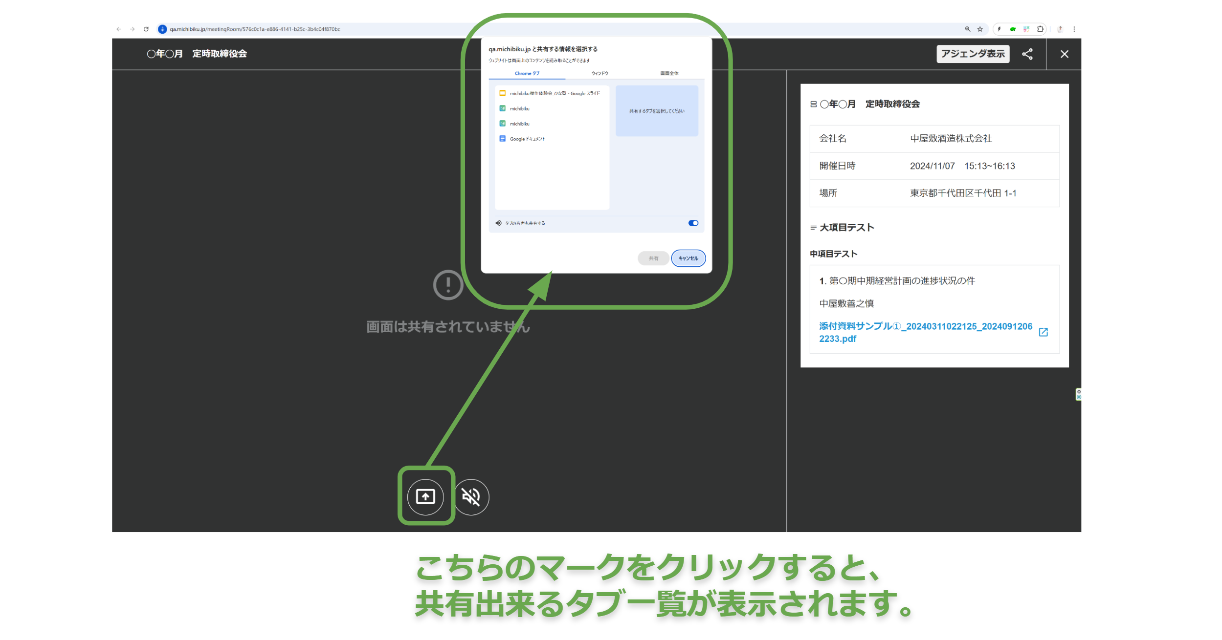 michibikuにはセキュアな環境内でPCの画面を共有する、または、共有受けられる「プレゼンモード」という機能が搭載されています。(有料オプション)