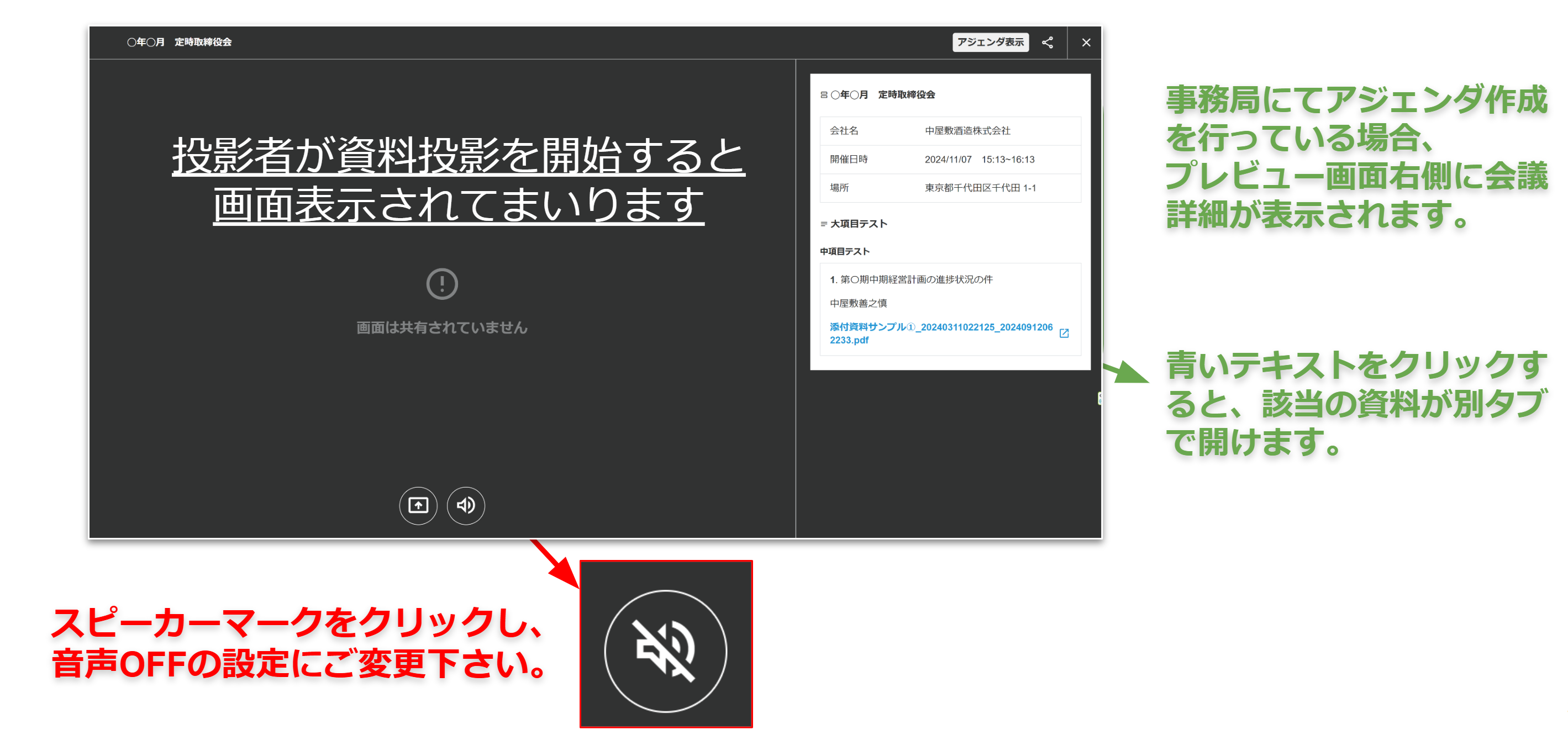 画面共有を受ける参加者は上記のスピーカーをOFFに設定いただけましたらセッティング完了です。