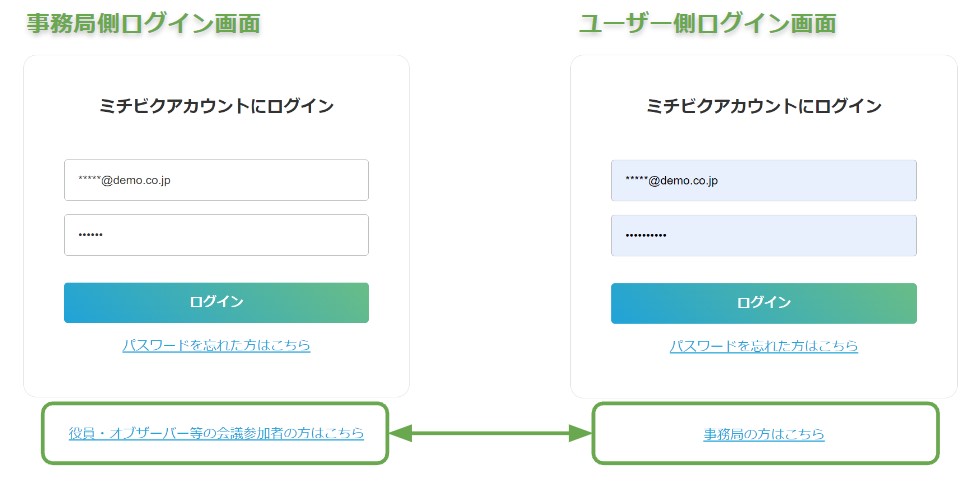 ログイン画面に、事務局側⇔ユーザー側の入り口を切り替えるリンクがあります。