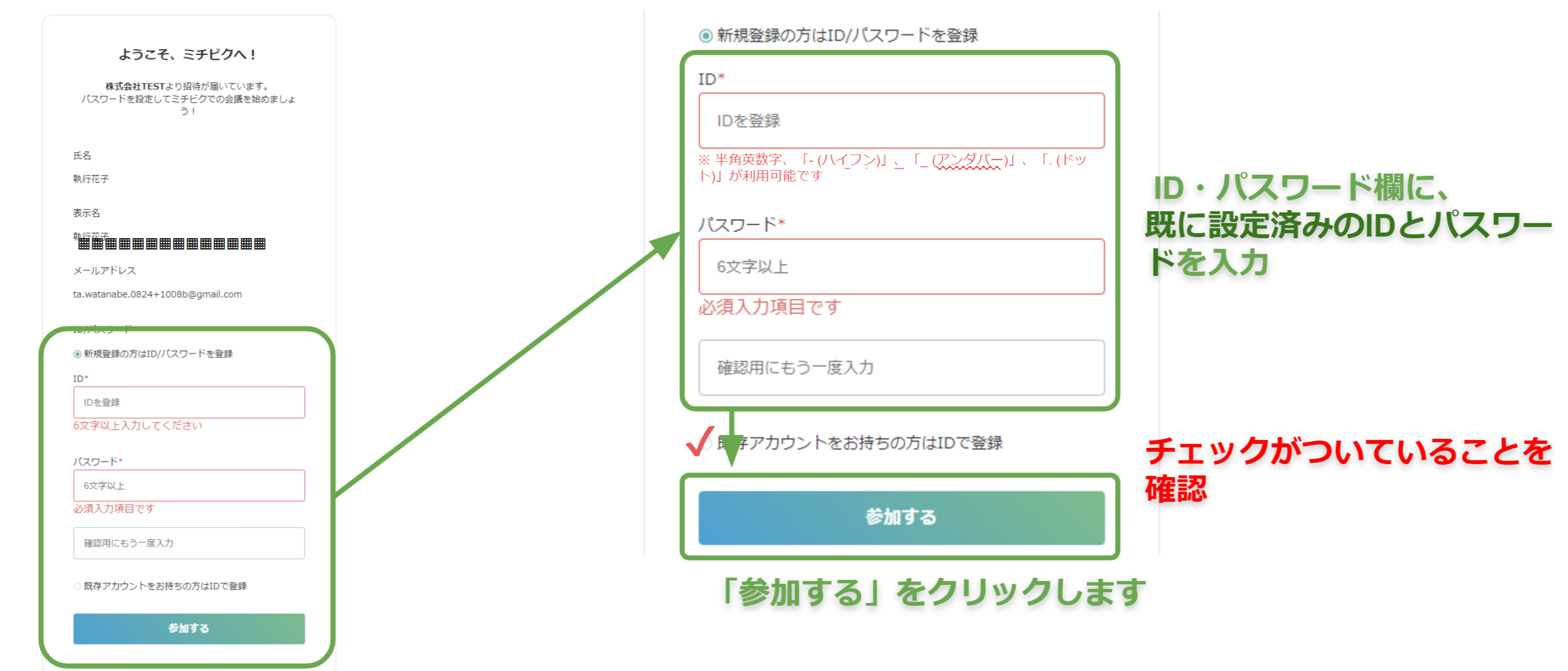 【招待された側が行うこと②】招待メールから「既存のアカウントをお持ちの方はIDで登録」より登録を実施