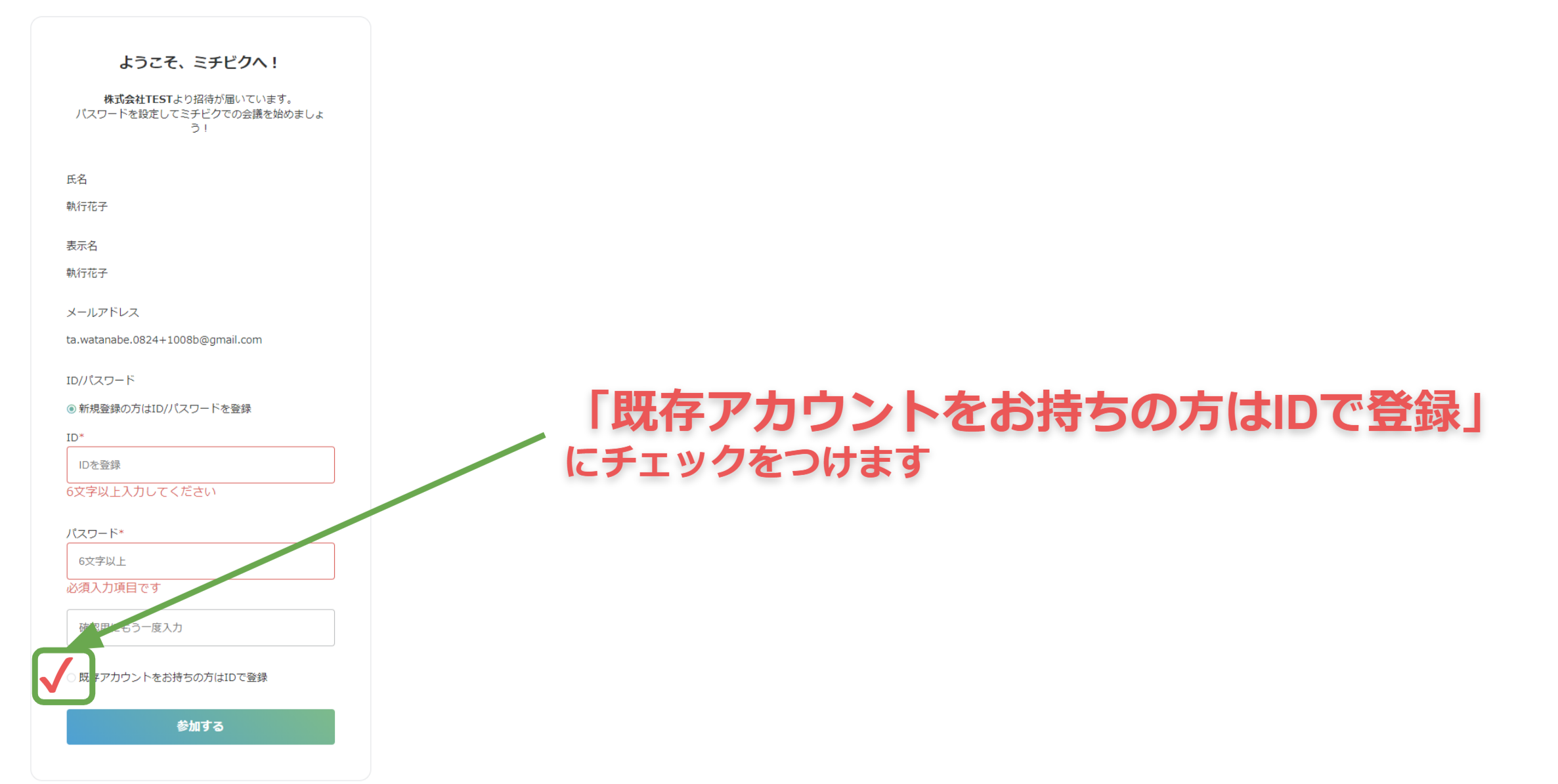 URLを開きましたら、まず「既存アカウントをお持ちの方はIDで登録」の☑を付与ください。